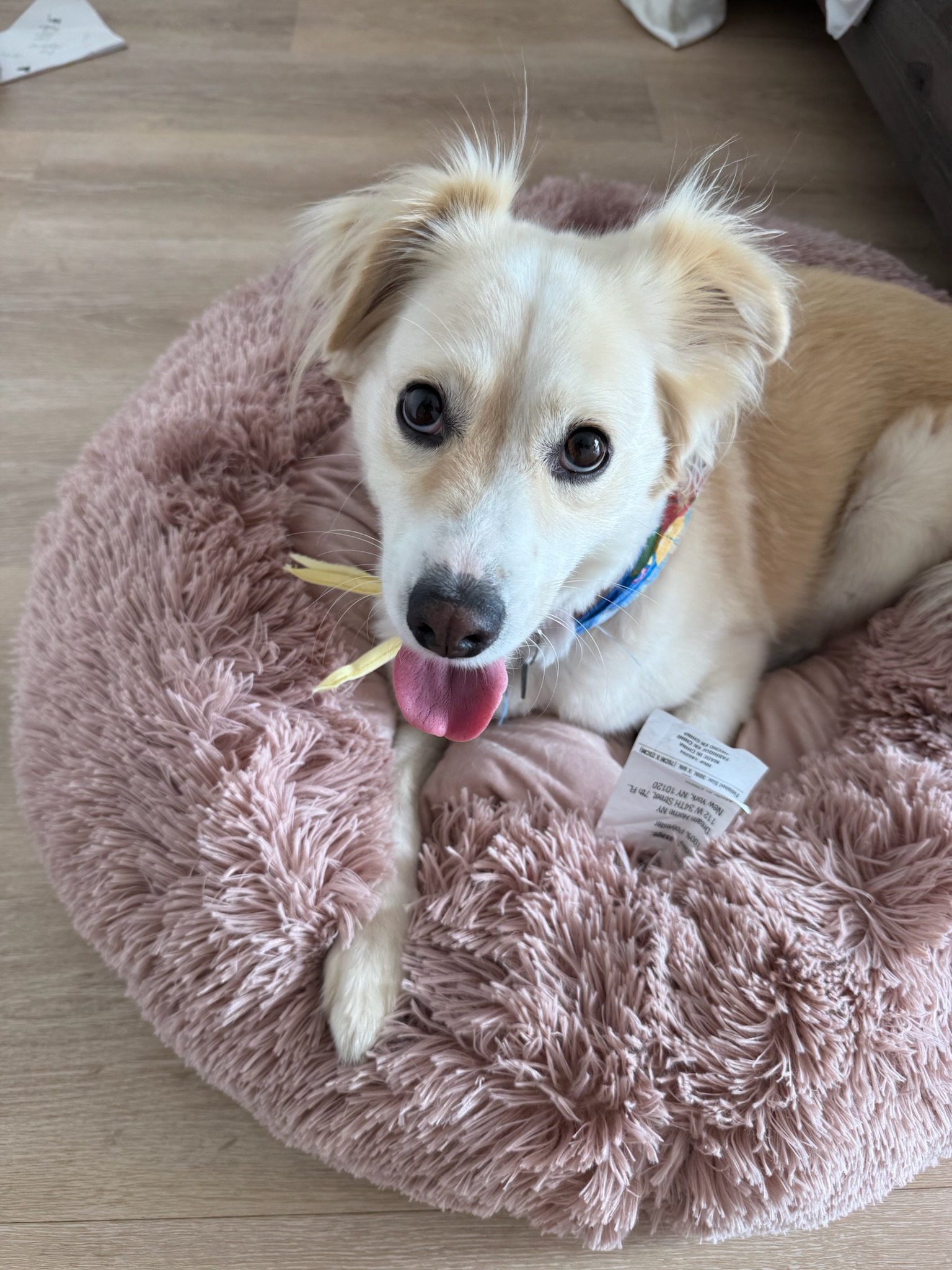 Here’s what we love about Junie: She’s a lap-lover who happily soaks up belly rubs, She’s friendly with everyone she meets , No food resource guarding , She’s smart and spirited, she’ll let you know when something isn’t her favorite!!
