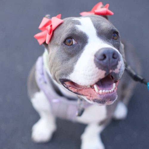 This pocket pittie is only 43 pounds and has the most gentle and affectionate nature. Sadly, she was overlooked in the shelter just because she’s a pitbull, and whoever dumped her even rudely cropped her ears. But Kira’s sweetness shines through it all.