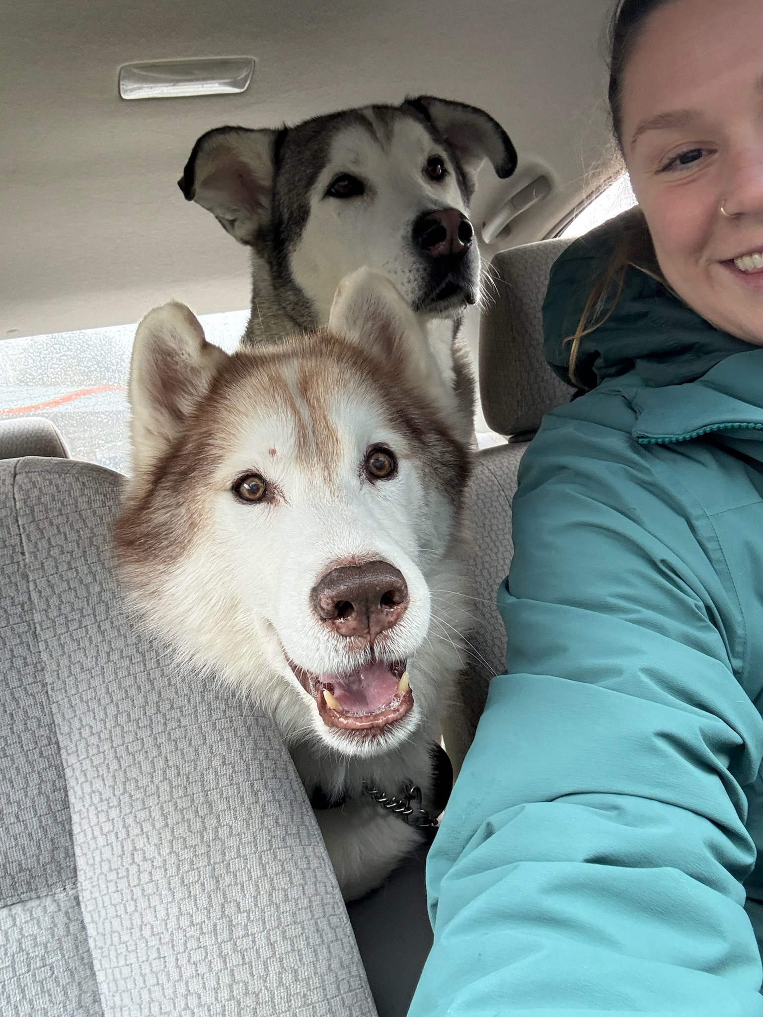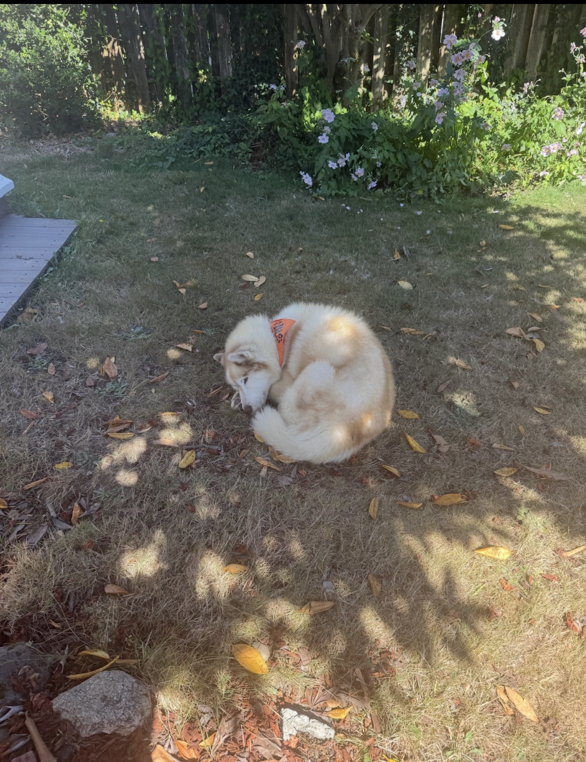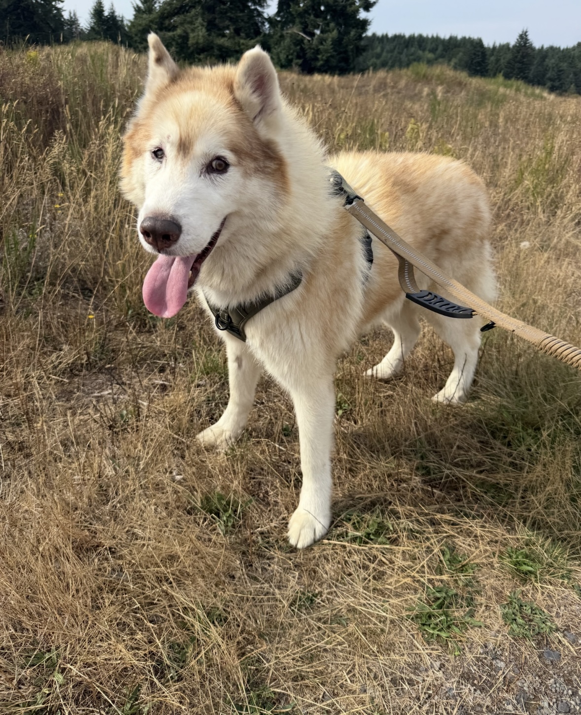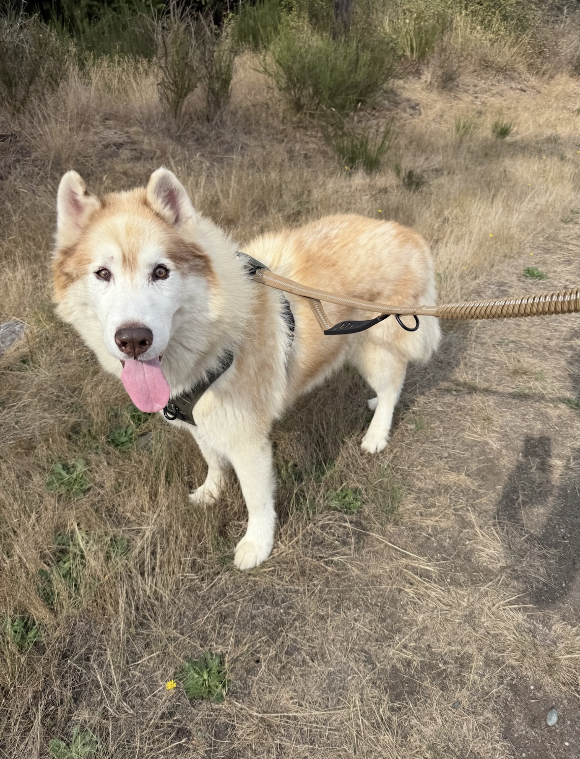 This gentle husky is proving to be an absolute sweetheart . He LOVES car rides (will even rest his head on your shoulder for kisses ), had the best time at the beach, and is happiest just hanging out in the yard soaking up the fresh air.